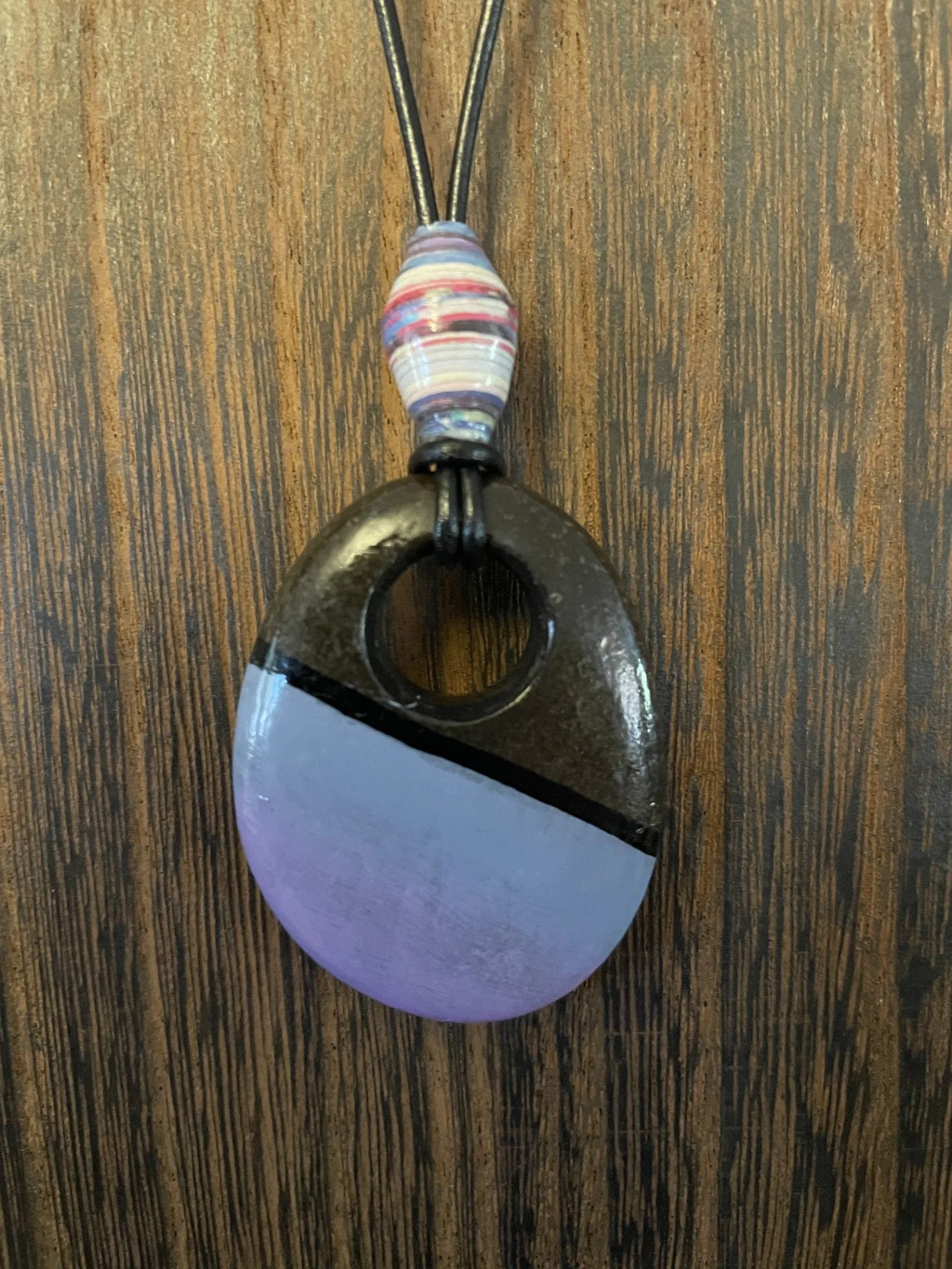 Complementing the pendant is a recycled paper bead, carefully crafted and sealed with varnish for durability and a subtle sheen. The bead adds an eco-conscious touch to the design, strung on a sturdy leather cord for a rustic, earthy feel.